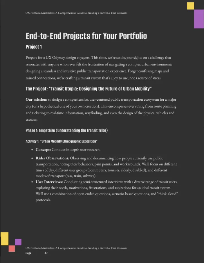 BONUS: The "Transit Utopia" Case Study A complete walkthrough of a complex, end-to-end project. See exactly how to document User Interviews and Persona Development to create a winning narrative. (Value: $67)